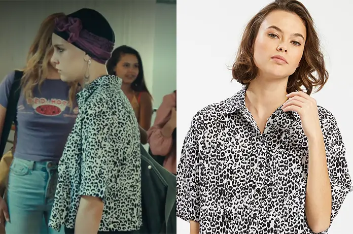Dans Lycée Toulouse Lautrec 1×05, Charlie (Juliette Halloy) porte une chemise à courtes manches avec un impirmé léopard.