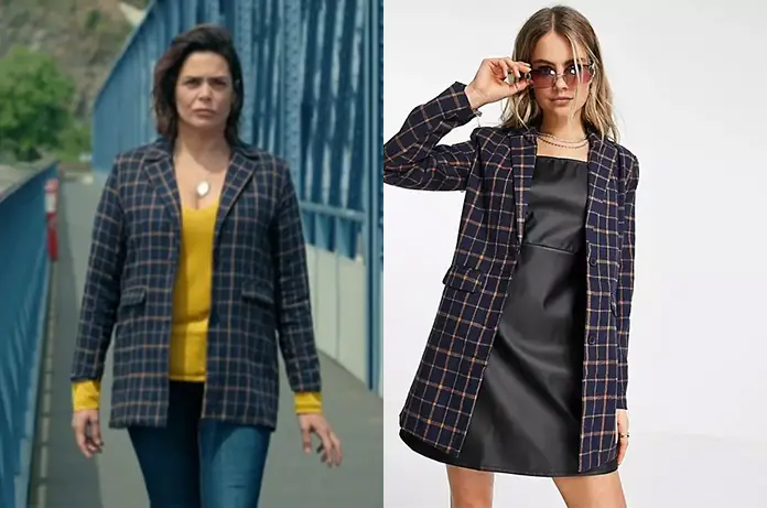 Elle pore un blazer bleu marine avec des carreaux aux bords orange.