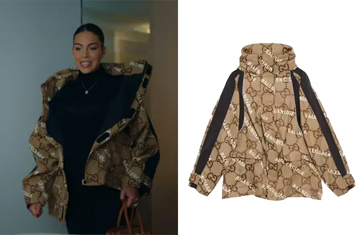 Georgina Rodriguez se rend chez son médecin, dans Moi, Georgina (Soy Georgina), sur Netflix, avec une veste sur laquelle on reconnait les logos Gucci et Balenciaga.