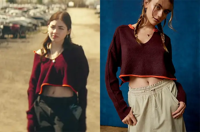 Elle porte un pull court bordeaux, avec un bord contrastant.