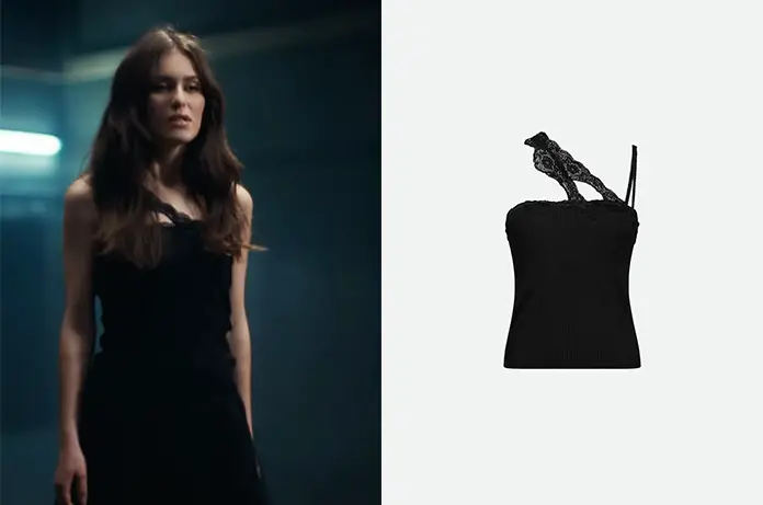Dans son nouveau clip « Respire fort », la chanteuse Jeanne a choisi un top noir asymétrique à détails de dentelle.