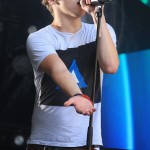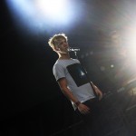 Démarche bien à lui (on pense quand même à un jeune Jagger…ou à un félin, mais attention, Mustii n’est PAS un chat), mimiques, expressivité du visage, mouvement des bras, Mustii sait occuper l’espace… Sa formation d’acteur n’y est peut-être pas étrangère. Petit slim noir à la taille très basse dévoilant un boxer Union Jack pas du tout de circonstance. Provocation ? Non, pas du tout…juste petit délire perso. Et un t-shirt aux formes géométriques bleue et noire.