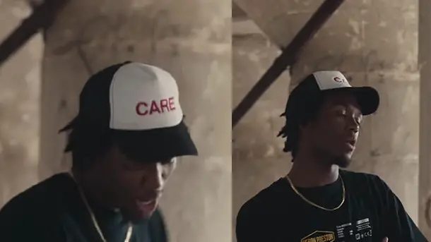 Saba porte une casquette Care (du merchandising perso, disponible ici) et un t-shirt Heron Preston, disponible ici