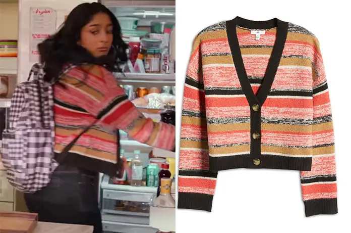 Devi (Maitrey Ramakrishnan) porte un cardigan court dans Mes premières fois (Never have I ever) 3×05. Il est malheureusement sold out