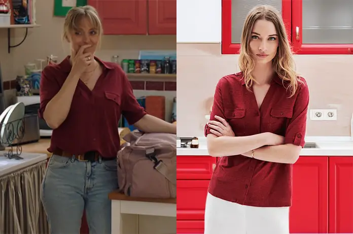 Audrey (Gabrielle Atger) porte cette chemise bordeaux en lin. On la trouve ici.
