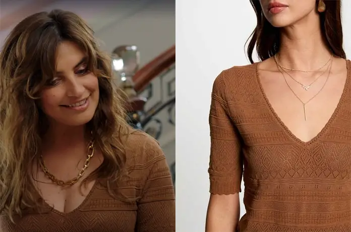 Émilia (Laetitia Milot) a choisi un petit pull cognac, à manches courtes ; il est disponible ici