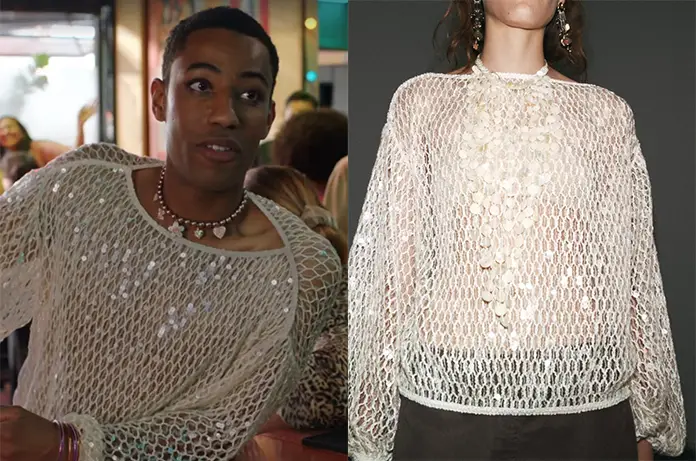 Roméo Kamara (Daby Seye) porte un top à sequins avec un large col bateau. Il n’est plus dispo.