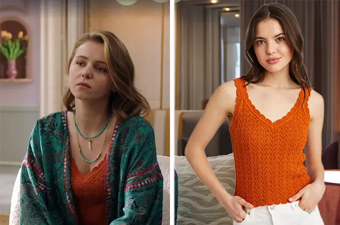 Théa (Marion Aymé) porte un top orange en crochet, que l’on peut acquérir ici