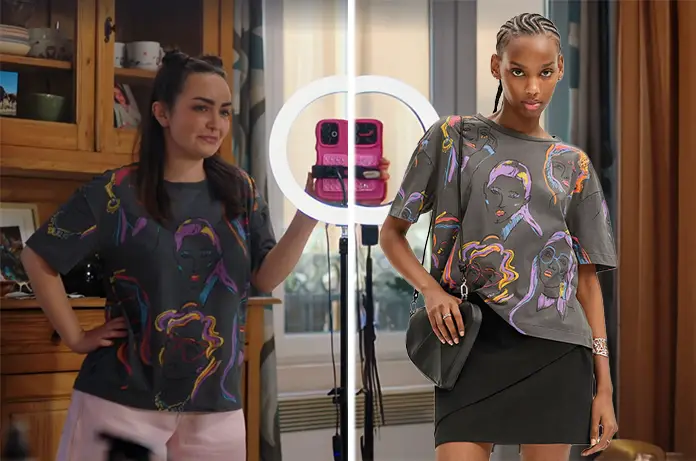 Sa soeur Camille (Nélia Keciri) a mis un t-shirt avec des visages imprimés. Un article Desigual.