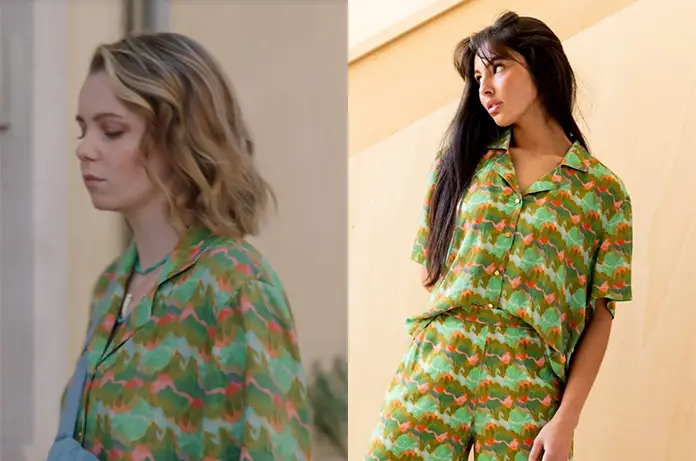 Théa (Marion Aymé) porte une chemise à manches courtes avec ce joli imprimé ; il s’agit de la blouse Daya de la marque Apaches collections.