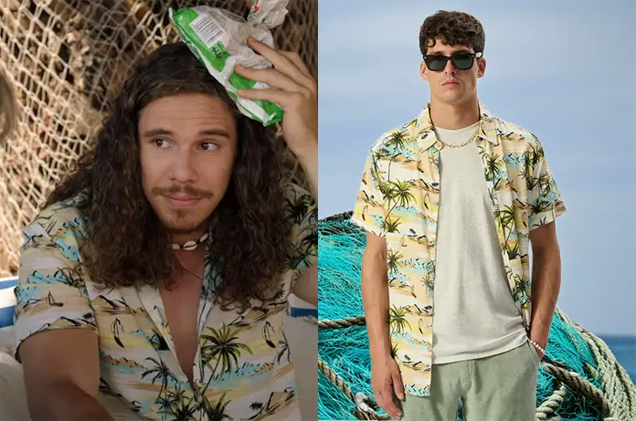 Adrian (Vinicius Dos Santos Lagier) travaille au club nautique avec une chemise hawaïenne que l’on peut acquérir ici.
