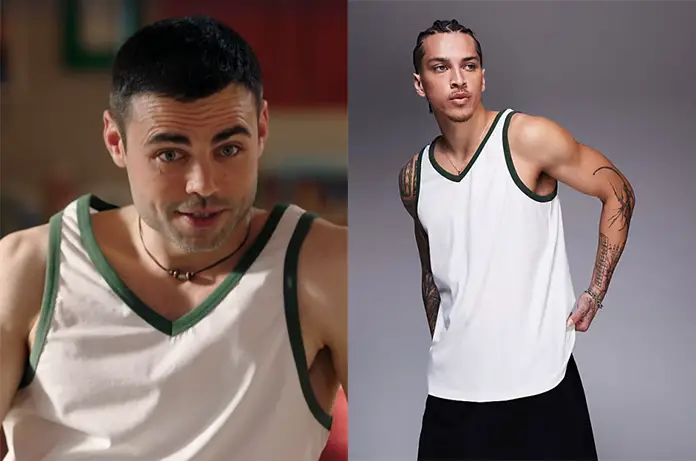 Liam Maillol (Thomas Brazete) porte un débardeur blanc aux bords contrastants, un modèle sold out.