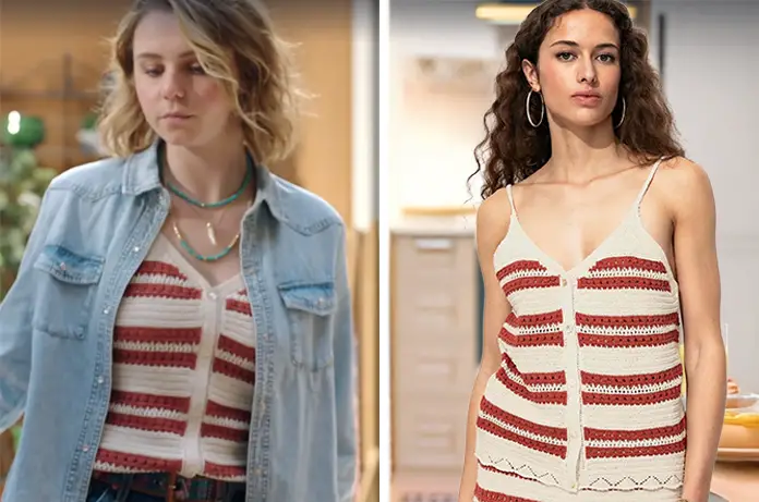 Théa (Marion Aymé) porte un débardeur à rayures sous sa chemise en jean. Il est dispo ici