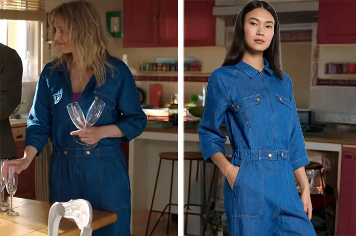 La maman de Théa s’appelle Audrey et est interprétée par Gabrielle Atger. Elle a choisi d’accueillir sa fille dans une combi en denim bleu que l’on trouve ici.