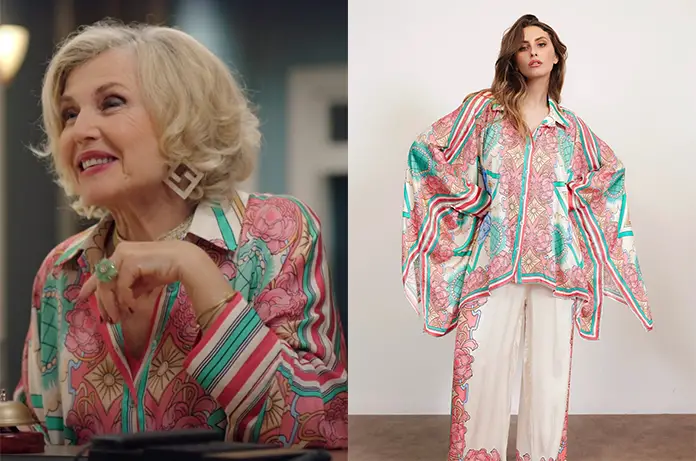 Joey, en un mot comme Beyoncé, interprétée par Manoelle Gaillard, semble être une cliente fantasque de l’Hôtel Bartoli. Elle porte une large blouse rose, en viscose et soie. On la trouvait ici.