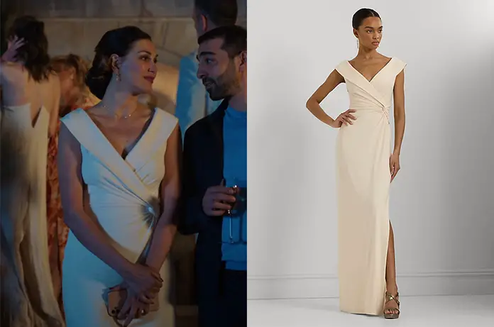 Pour présenter rapidement tous les personnages sur un même décor, rien de tel qu’un mariage. Ici il s’agit de celui de Louise Bartoli (Helena Noguerra) dans une très belle robe crème disponible ici
