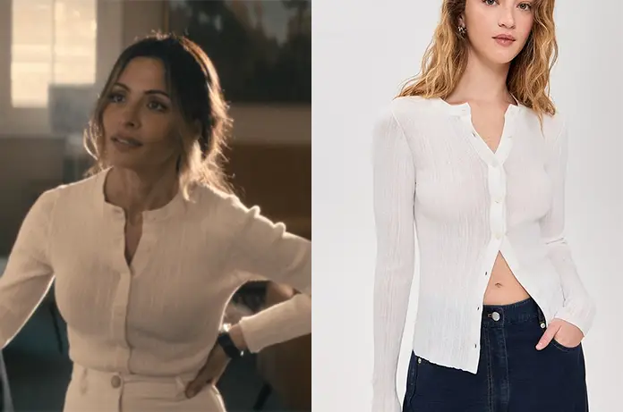 Dans le 3e épisode de Paradise sur Disney +, le docteur Gabriela Torabi (Sarah Shahi) discute avec Xavier dans des jardins. Elle porte un manteau blanc que l’on trouve ici ou ici
