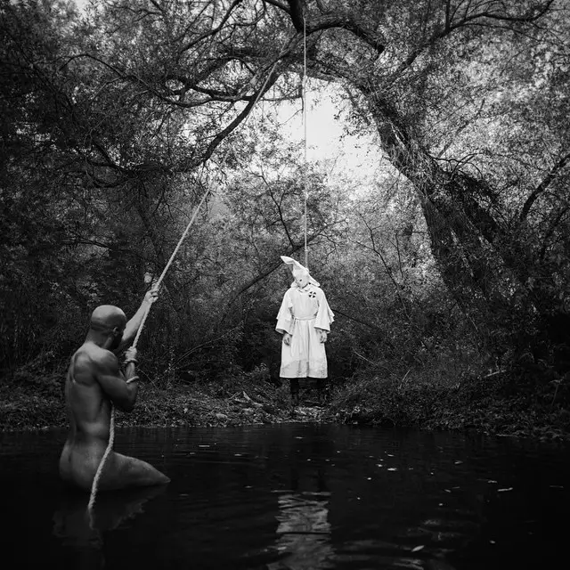 Ricky Whittle, l’acteur britannique qui interprète Lincoln, le Terrien dans la série The 100 est très fier de la photo qu’il a faite pour Tyler Shields. On l’y voit nu en train de (dé)pendre un membre du KKK… La photo fait partie de l’exposition Historical Fiction à la galerie Andrew Weiss (d’aujourd’hui au 30 juin).