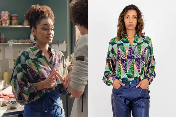 Aya (Johanna Boyer) porte, dans Plus belle la vie encore plus belle épisode 29, une chemise avec figures géométriques dans des tons de violet, vert et bleu