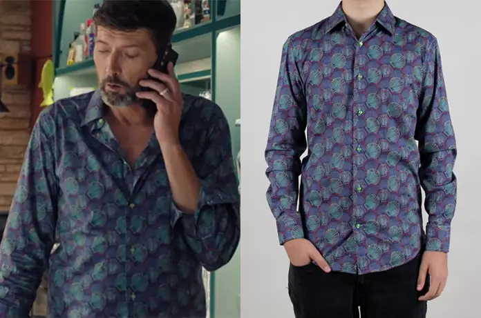Il porte une chemise imprimée coquillages que l’on retrouve ici.