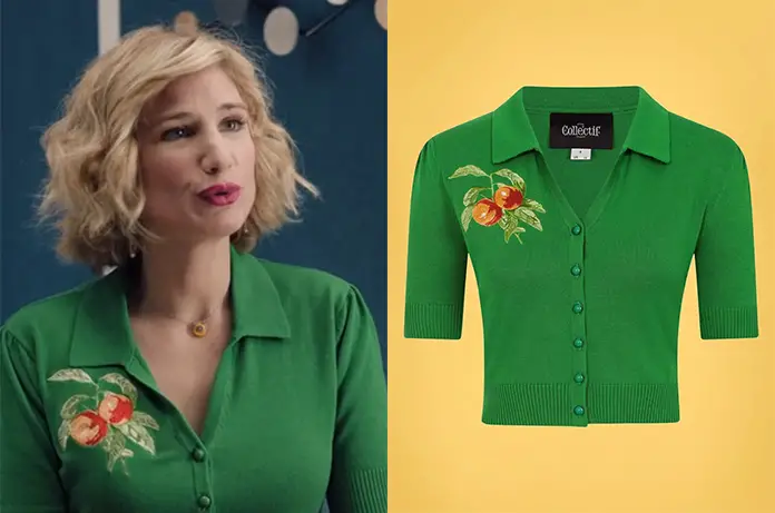 Jennifer Maseron (Diane Dassigny) porte un petit cardigan vert, avec des pêches brodées. Un modèle inspiré des années 50. On en trouve ici.