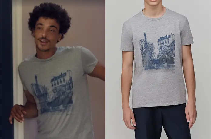 Baptiste (Bryan Trésor) porte ce t-shirt gris avec une vue sur la Tour Eiffel dans « Plus belle la vie encore plus belle » épisode 479.