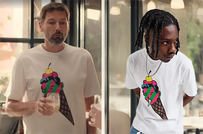 Thomas (Laurent Kérusoré) porte un t-shirt blanc avec un cornet de glace à tête humaine dans Plus belle la vie encore plus belle épisode 349.
