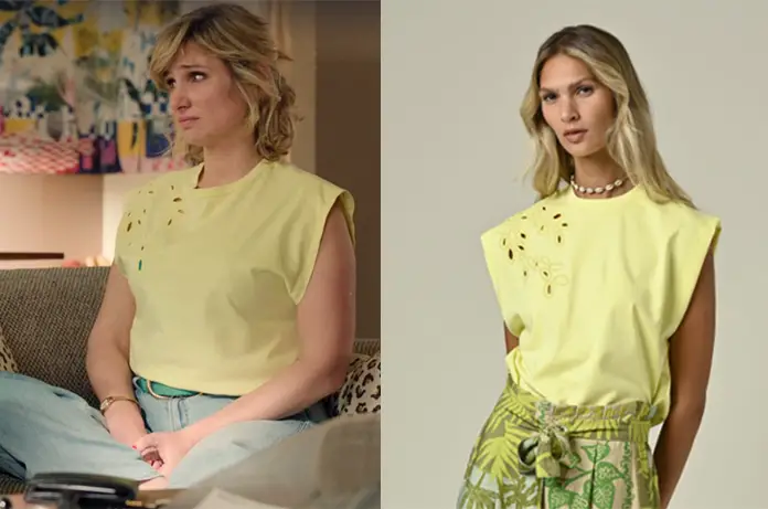 Jennifer (Diane Dassigny) essaie de mettre un peu de joie dans sa vie en portant ce top jaune ajouré dans l’épisode 372 de Plus belle la vie encore plus belle.