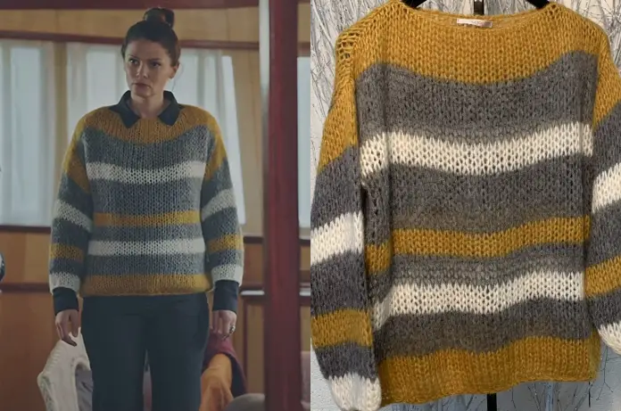 Élodie (Stéphanie Pasterkamp) s’apprête à apprendre deux informations détonantes dans Plus belle la vie 4442. Elle porte un pull à larges rayures ocre, grises et blanches que l’on trouvait ici, chez Sugar, une marque marseillaise.
