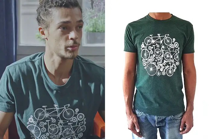 Dans Plus belle la vie 4377, Baptiste (Bryan Trésor) porte un t-shirt avec un vélo et un ensemble de mécanismes imbriqués. On le trouve ici
