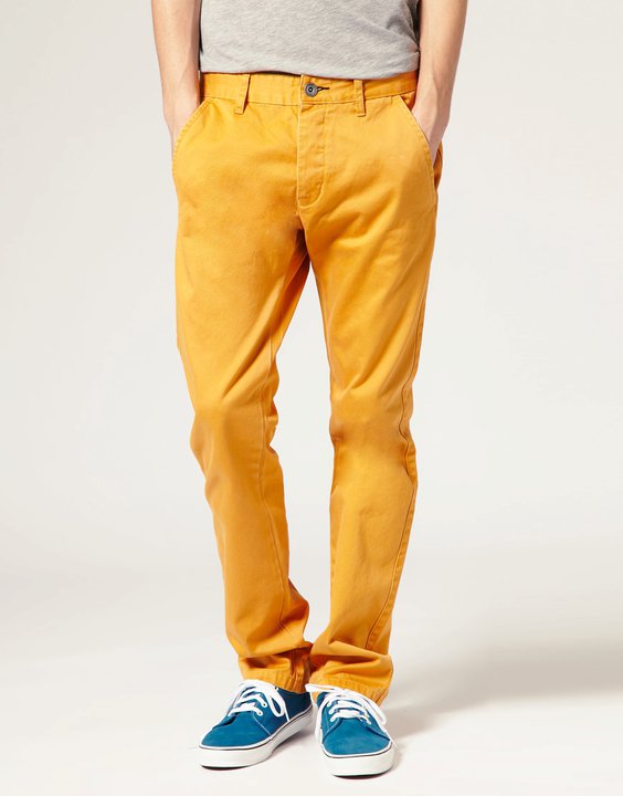 Une paire de jeans jaune, c’est un poil audacieux, et j’adore les pompes bleues assorties.Jeans jaune, on pense tout de suite à Chuck Bass, habitué aux couleurs vives.