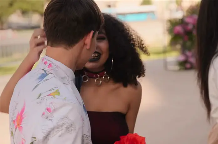 Pour aller danser à son bal de promo, Diego a finalement choisi un blazer avec des aquarelles de lys en imprimé. Cela se passait dans Queer Eye 6×04 sur Netflix.