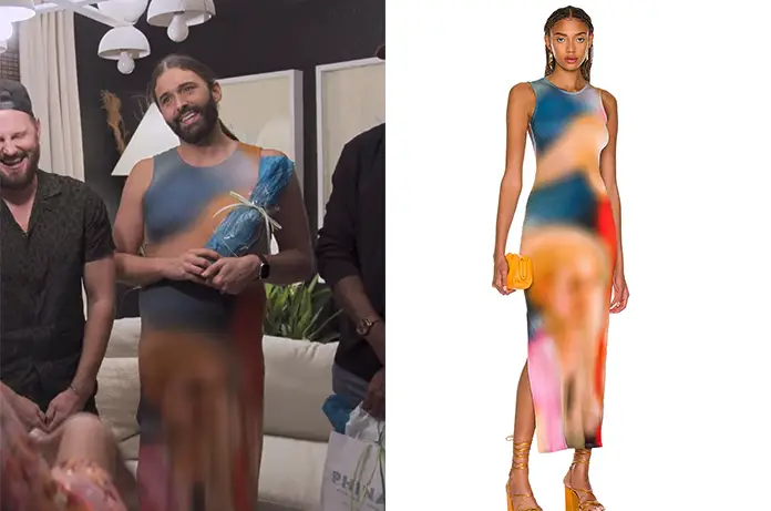 A la fin de Queer Eye 7×04, Jonathan porte une longue robe avec des couleurs floutées.