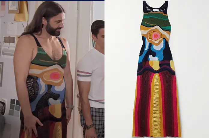 Jonathan porte cette incroyable robe crochetée dans Queer Eye 7×03. le dessin est inspiré de celui d’un enfant de la styliste Gabriela Hearst.