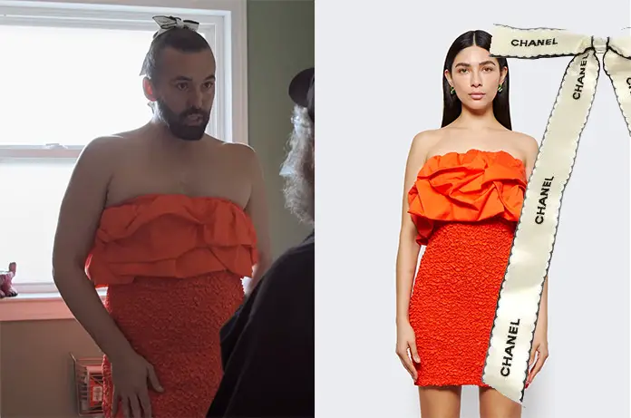 Dans Queer eye 8×02, Jonathan Van Ness porte une robe rouge épaules dénudées avec un volumineux drapé sur le haut. Dans les cheveux, il a accroché un ruban sur lequel on distingue le logo Chanel.
