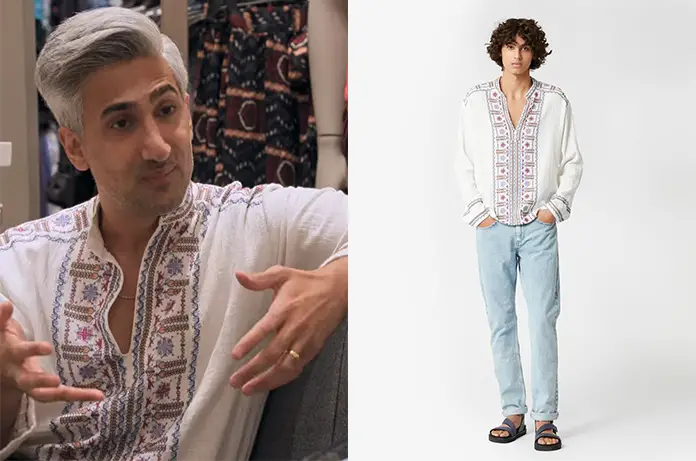 Tan France porte une blouse brodée dans Queer Eye 8×03.