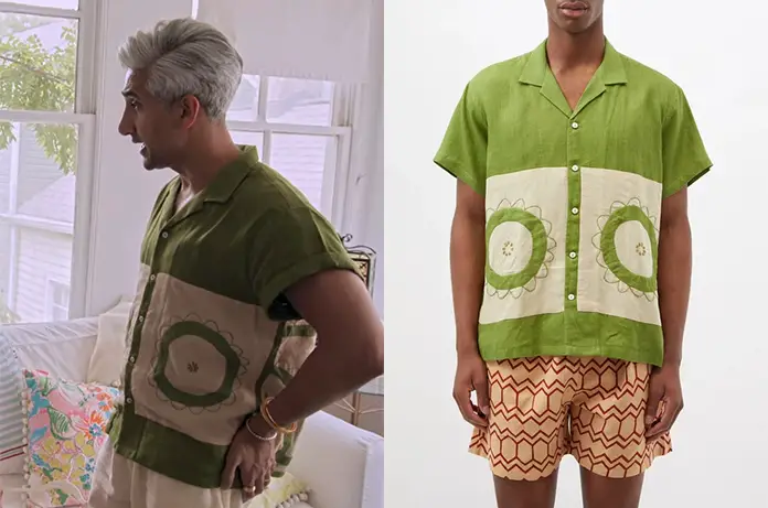 Tan France porte cette chemise verte avec des fleurs brodées dans Queer Eye 7×04.
