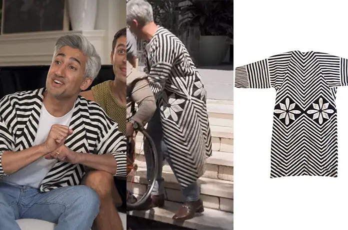 Dans Queer Eye 7×05, on voit Tan avec un long manteau (cardigan, kimono ?) rayé noir et blanc.