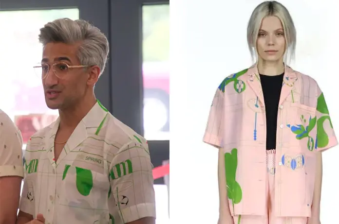 Tan France porte au début de l’épisode 6×06 de Queer Eye cette chemise avec cet imprimé vert et bleu… et le mot spring. Il s’agit d’un article de la collection Eté 2021 « The Spring We Lost » de la marque coréenne MINJUKIM. Nous ne l’avons pas retrouvé en vente sur internet.
