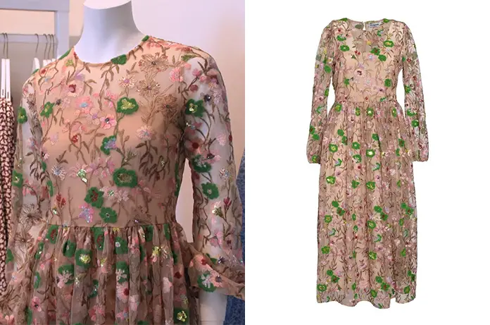 Tan se rend dans un magasin avec Anh Luu dans Queer Eye 8×06. Sur un mannequin, on voit une de cocktail, brodée de fleurs vertes.