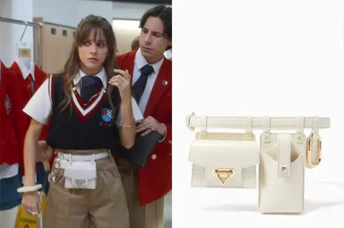 Dans Rebelde 1×02, Jana (Azul Guaita), porte une ceinture blanche avec une petite bourse avec boucle dorée. Il s’agit du sac Jack de Salar Milano. On le trouve en divers coloris