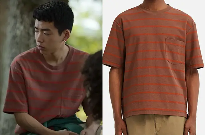 Zhao (Jaime Wang) porte ce t-shirt avec des rayures rouges dans Rien qu’une fille ordinaire (Tú no eres especial), sur Netflix. Il s’agit d’un modèle Uniqlo de la capsule Uniqlo x Christophe Lemaire (2019). On l’a vu sur eBay