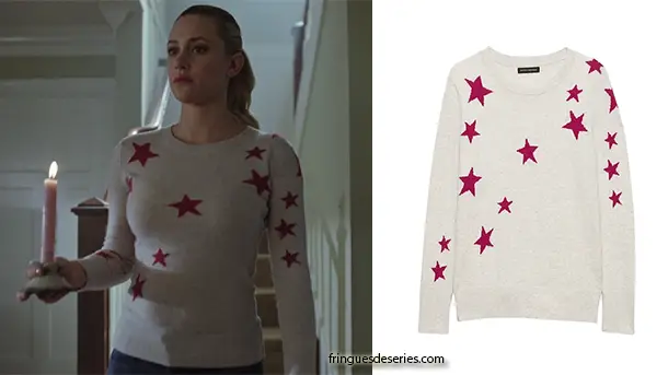 Et voici Betty Cooper (Lili Reinhart) avec un joli pull gris avec des étoiles magenta dans l’épisode 14 de la saison 3 de Riverdale. On le trouve ici