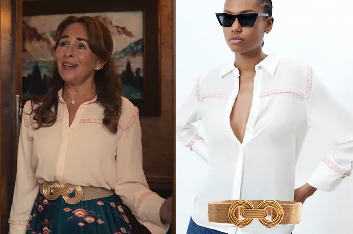 Dans Sex Education 4×01, Maureen (Samantha Spiro) porte cette chemise avec des rubans rose pastel appliqués aux poignets, aux épaules. Elle porte une ceinture élastique avec deux boucles dorées. Le tout vient de Zara.