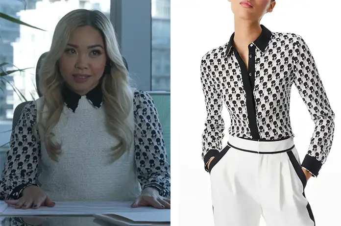 Francesca (Li Jun Li) porte sous un pull blanc une chemise avec des visages imprimés, dans Sex/Life 2×03. Il s’agit d’un modèle de la marque Alice + Olivia.