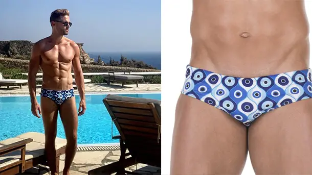Arno Diem est de retour en Europe, mais compte bien continuer à profiter du soleil, puisqu’il passe quelques jours de vacances à Mykonos où il peut, à loisir, exposer sa plastique parfaite… et ses petits maillots de bain. Il a choisi l’œil grec porte-bonheur comme motif pour un slip de bain Carioca.