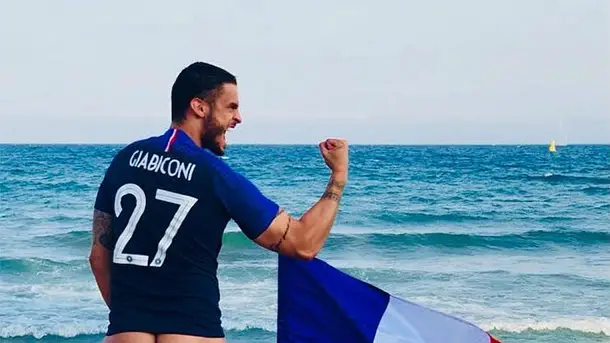 Le mannequin et chanteur Baptiste Giabiconi a voulu montrer à s a façon sa joie de la victoire des Bleus à la Coupe du Monde de foot 2018 par ce cliché sur son compte Instagram. Il n’est pas sans faire penser à une toile de Pierre et Gilles de 2009 le petit footbaleur.