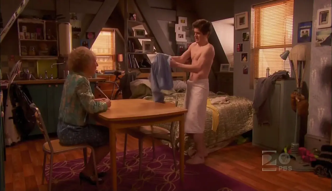 Iwan Rheon qu’on a connu dramatiquement sinistre dans Game of thrones a aussi des talents comiques. Il exploite ce registre dans la série Vicious. Cette série a eu un épisode final, cette année, diffusé aux États-Unis en juin dernier. Il le sera seulement en décembre en Grande-Bretagne. On le voit donc vêtu de très improbables t-shirt canari et short rose, ou alors tout simplement d’une serviette