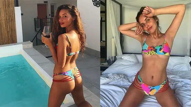 La jolie Alice Révérend (Lola dans Demain nous appartient) ne craint pas la canicule : piscine et bikini. Pour défier le soleil andalou, la belle actrice a choisi un bas de bikini coupe tanga plutôt sexy avec des lanières rouges à petits noeuds. On le trouve ici, à prix promo