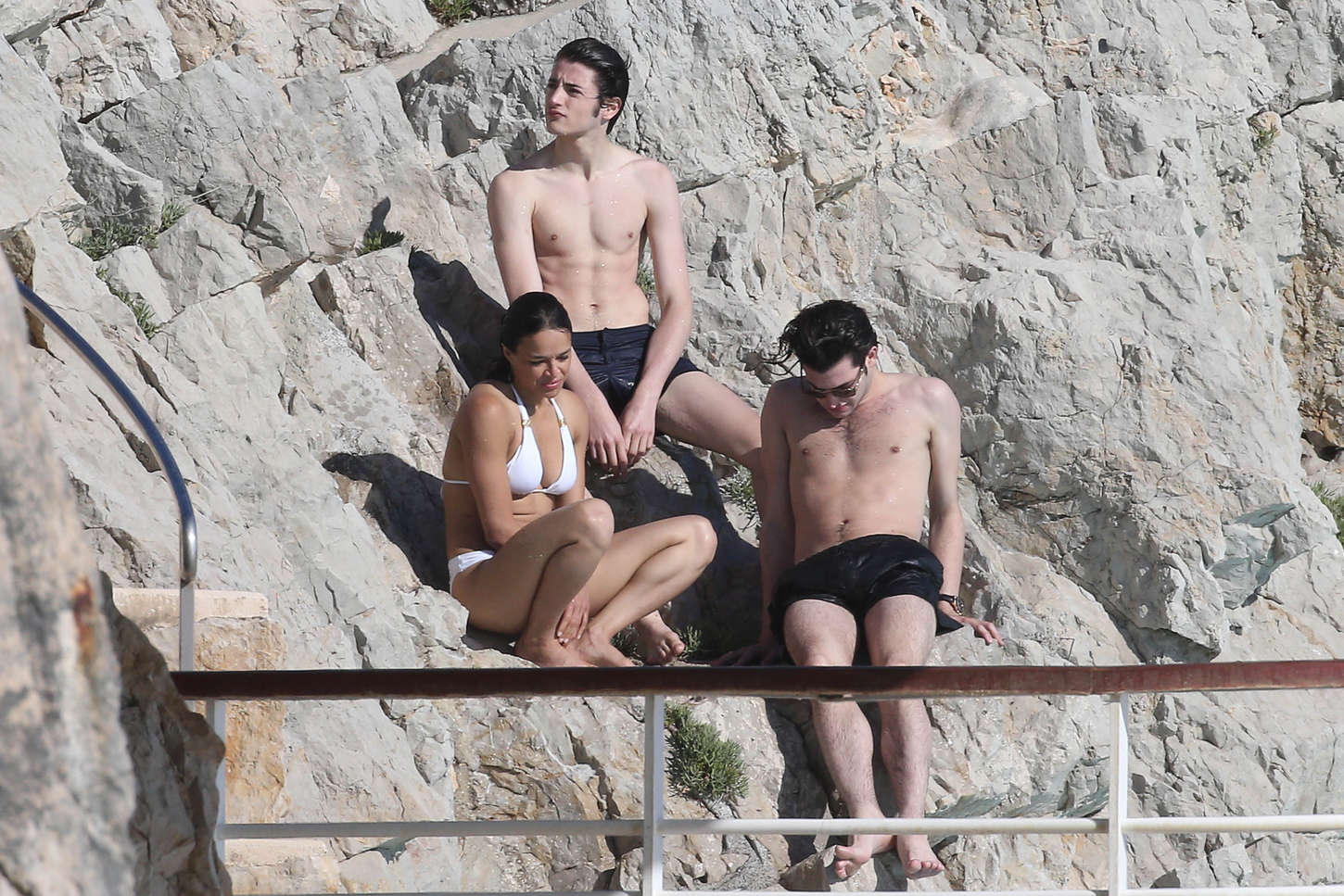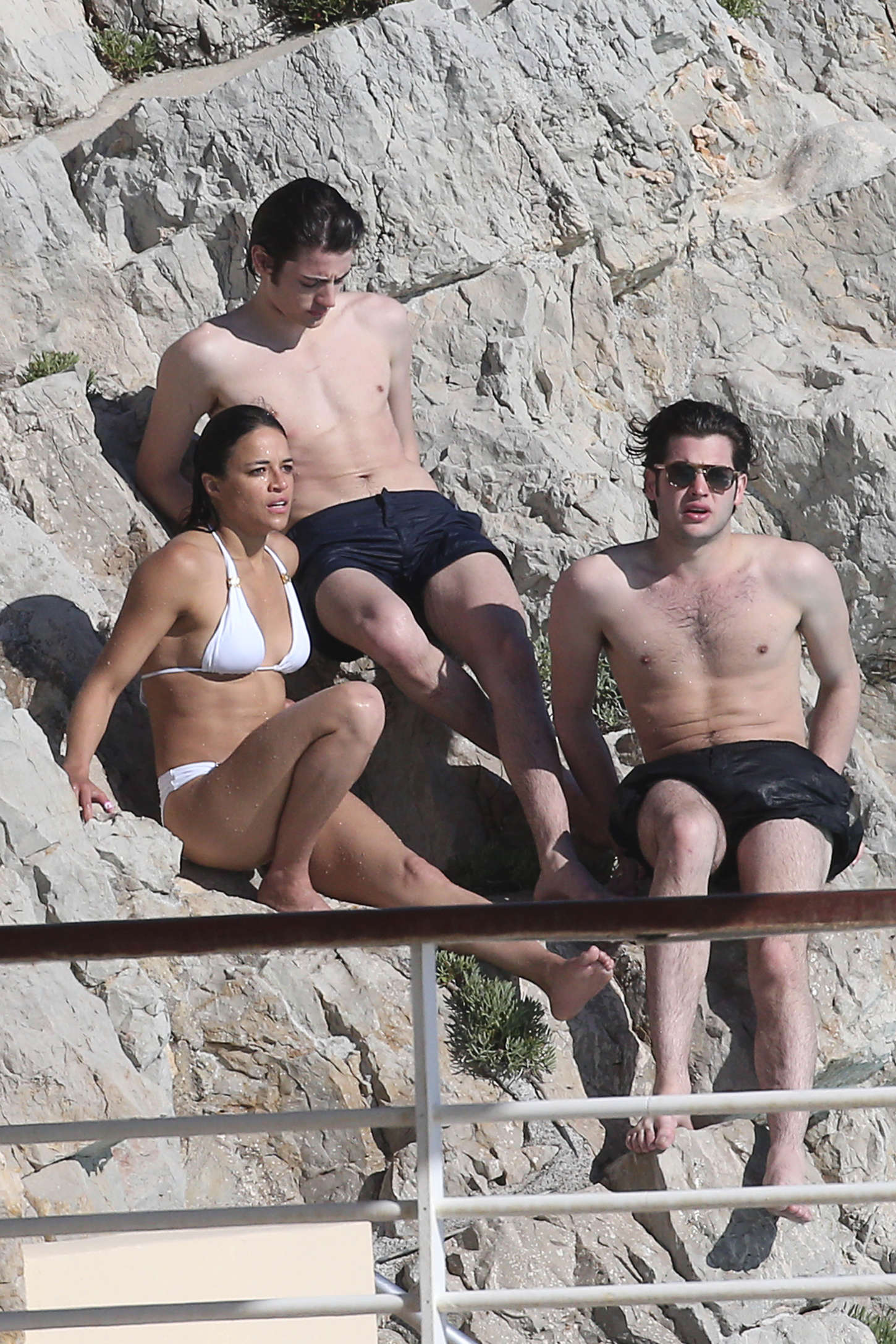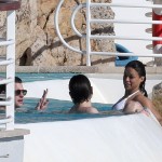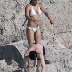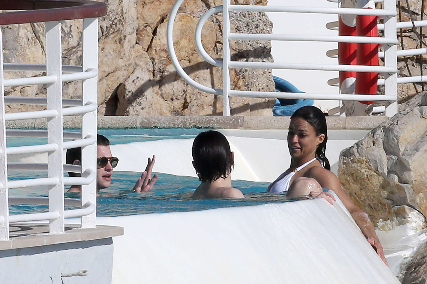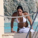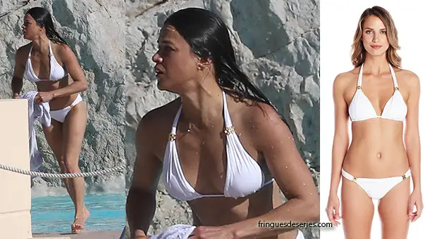 Michelle Rodriguez alterne à Cannes robes de soirées et bikinis… On vous présente ici la seconde proposition. A la piscine avec quelques amis, l’athlétique actrice de Fast and Furious ou de Lost a choisi un bikini blanc de la marque Vix.